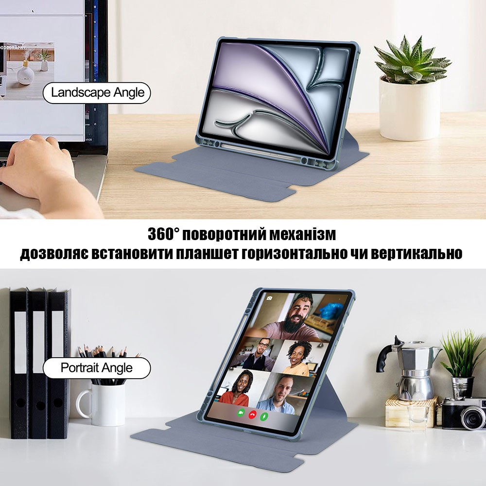 - Чехол оснащен поворотным механизмом, который позволяет выбрать ориентацию для установки в подставке: горизонтально или вертикально.