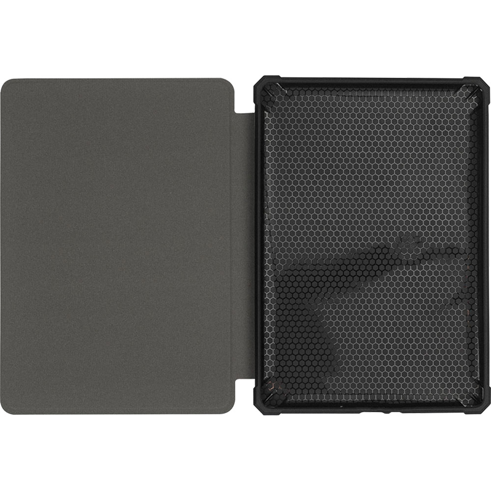 - Зовнішня частина обкладинки виготовлена із міцної штучної шкіри, всередині верхньої кришки знаходиться тонка жорстка пластикова пластина. Контейнер, в який вставляється книга, виготовлений не з пластику, як у більшості інших чохлів, а з термопластичного поліуретану (TPU). Цей матеріал має чудові захисні властивості. Завдяки своїй еластичності та пружності, TPU ефективно поглинає енергію удару, при цьому обкладинка за жодних умов не трісне під час падіння.