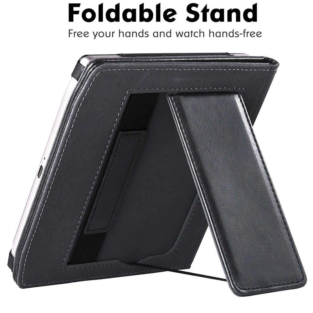 - Напевне, головна перевага цього чохла — висувна ніжка-підставка, яка дозволяє встановити книгу вертикально на столі і звільнити руки.