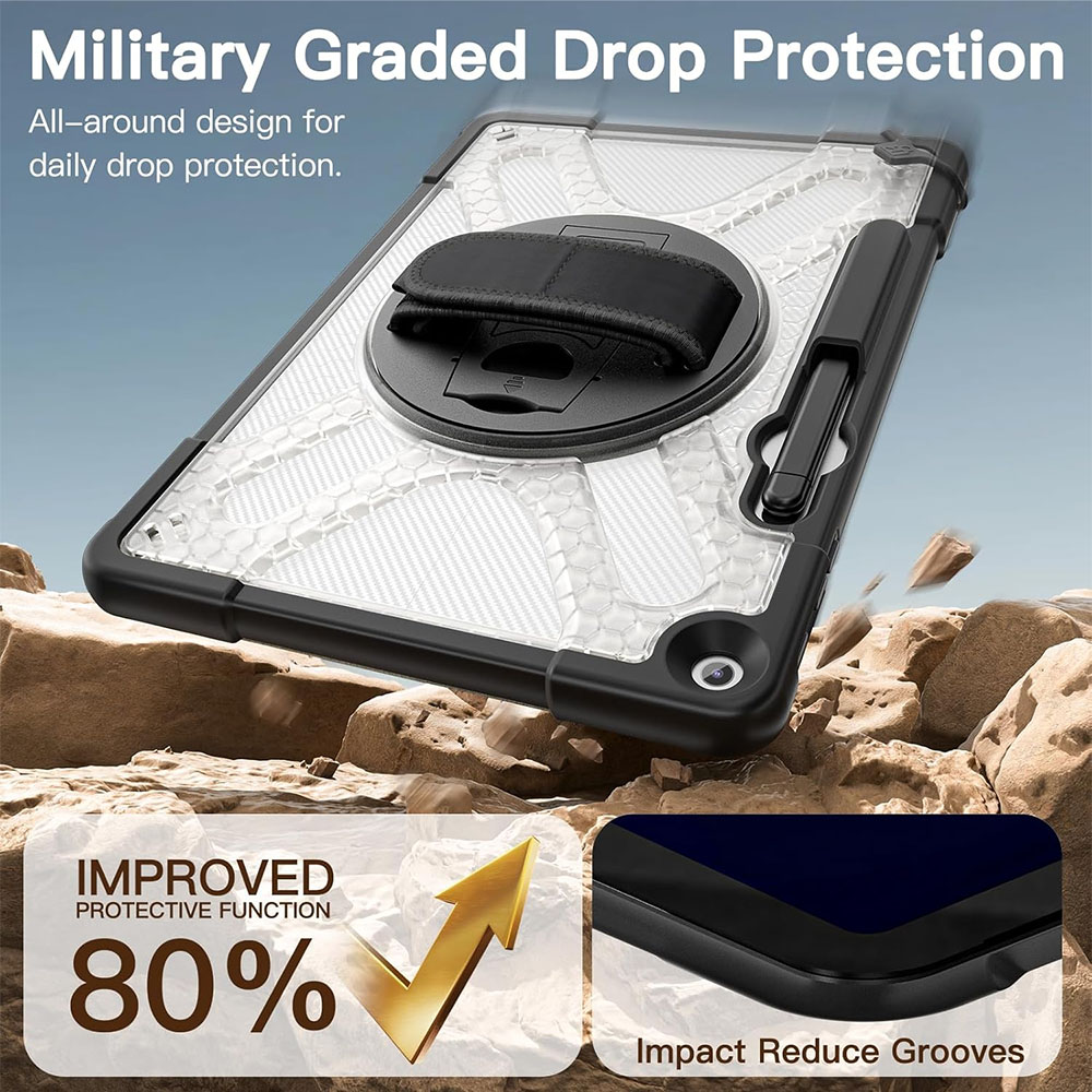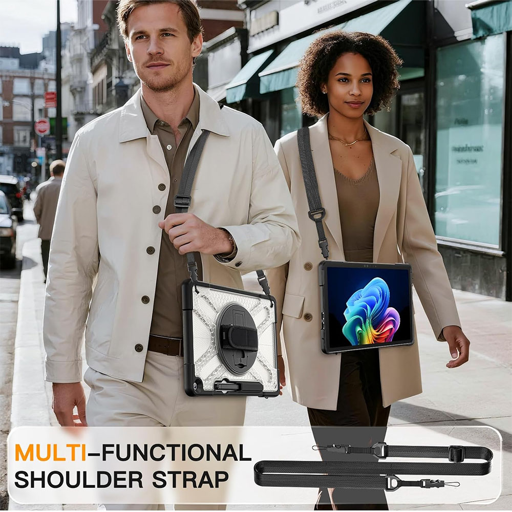Цей чохол створений для тих, хто використовує Surface Pro 12 активно — в роботі, навчанні або в дорозі. Посилена конструкція з комбінації пластику та TPU ефективно захищає планшет від ударів і падінь, а антиковзка текстура допомагає впевнено тримати його в руках. Завдяки поворотному механізму на 360° і вбудованій підставці ви можете легко змінювати положення планшета — від перегляду відео до роботи з документами. Регульований ремінець на руку робить використання зручним навіть на вазі, а плечовий ремінь дозволяє носити пристрій як сумку — це особливо корисно в поїздках або під час активної роботи.
