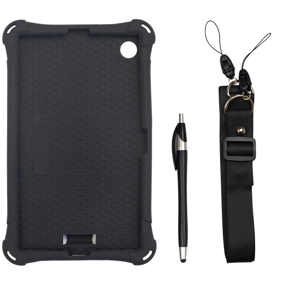- В комплект входить зручний ремінь, що дозволяє повісити планшет на шию або закріпити його на підголовнику в авто, а також ємнісний стілус для екрана.