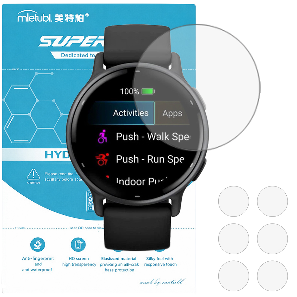 Гідрогелева плівка Mietubl Super TPU HD для Garmin Vivoactive 5 забезпечує надійний захист дисплея смарт-годинника без втрати якості зображення та чутливості сенсора. Вона точно повторює форму екрана, включно із заокругленими краями, та щільно прилягає до поверхні, зберігаючи природну передачу кольорів і яскравість.